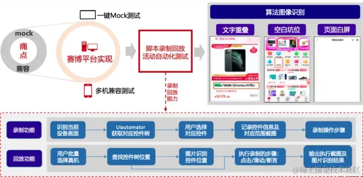 针对兼容机型多,测试耗时长等问题,赛博云测平台实现了一键录制回放功能。测试人员只需要输入活动链接,勾选必过机型,便可一键执行,不依赖测试人员的代码能力,小白也能独立完成自动化测试。同时引入算法图像识别能力,对于常见的文字识别、空坑、白屏、掉楼等问题,系统自动识别并在报告中对问题图片打标,减少人工check图片工作量。