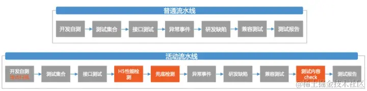 我们将以上效能提升工具集成到测试流水线节点,建设了活动特有流水线。在一个测试平台即可完成各个环节的测试,减少多工具平台切换带来的测试负担,同时也作为新人指引,可以快速了解活动测试的必要环节。