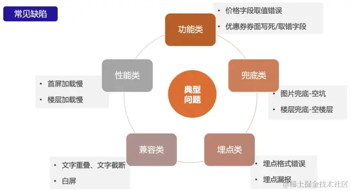 按照测试类型,将大促常见的质量问题分为功能类、兜底类、埋点类、兼容类、性能类。