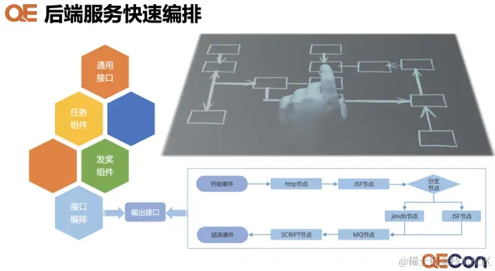第三提供接口编排服务,该服务提供丰富的节点能力,业务端研发通过拖拽及编写js脚本即可生成所需要的接口,点击发布即可线上调用,省掉了重复编写代码、服务部署、网关接口注册等流程。