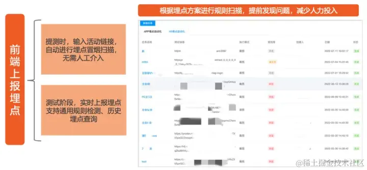 针对埋点问题多,反复修改验证耗时长的痛点,我们结合埋点规范,实现埋点冒烟测试。研发自测阶段可输入埋点方案和活动链接,系统自动检测不符合规范的埋点,并生成检测报告,前置发现并解决问题,减少测试介入。