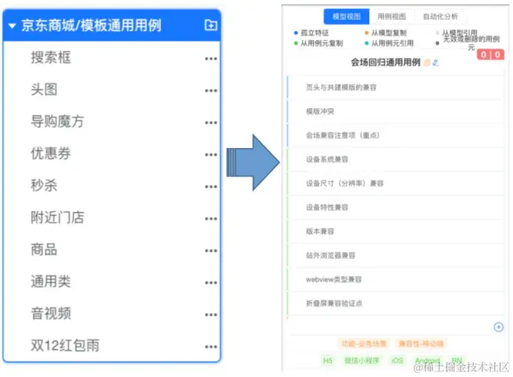 在领域模型建设方面,我们对模版和会场分别沉淀了通用用例模型,覆盖了常见需求的测试点。对于常规需求,测试人员可以直接引用通用用例,节省用例编写时间,并通过用例获取重点关注信息,避免漏测。