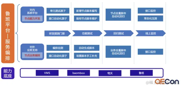 后端接口编排服务实现了接口快速生成,但编排逻辑是否正确、接口返回结果是否符合预期、接口性能如何,都需要测试介入进行保障。我们从对内系统平台建设和对外业务支持两个视角出发,搭建了服务编排规范化流程。