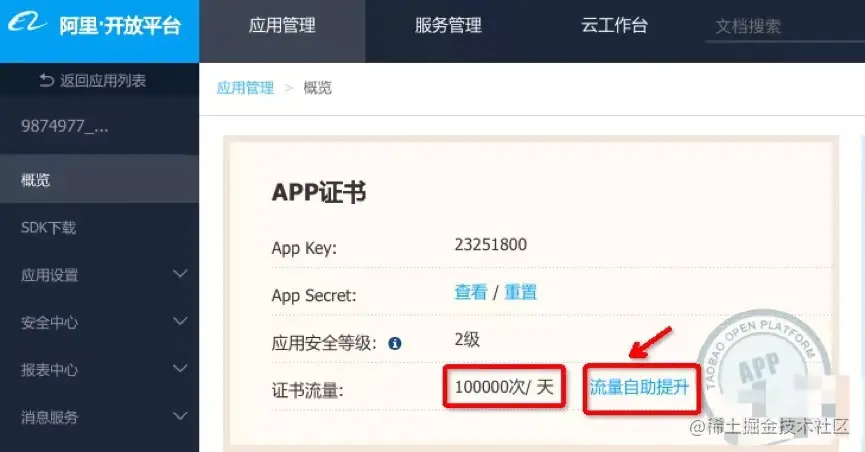 申请APPKEY: 审核通过后,点击 查看权限申请权限 ,申请需要的 APPKEY。按点击申请权限会跳到阿里开放平台,按流程操作即可。查看APPKEY: 申请成功后,在相应位置即可查看。