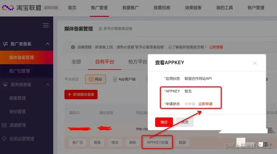 一、备案后可申请appkey 自有平台(除线下阵地-个人)/他方平台(除达人个人)/无自有阵地,对应备案后,均可申请appkey。
