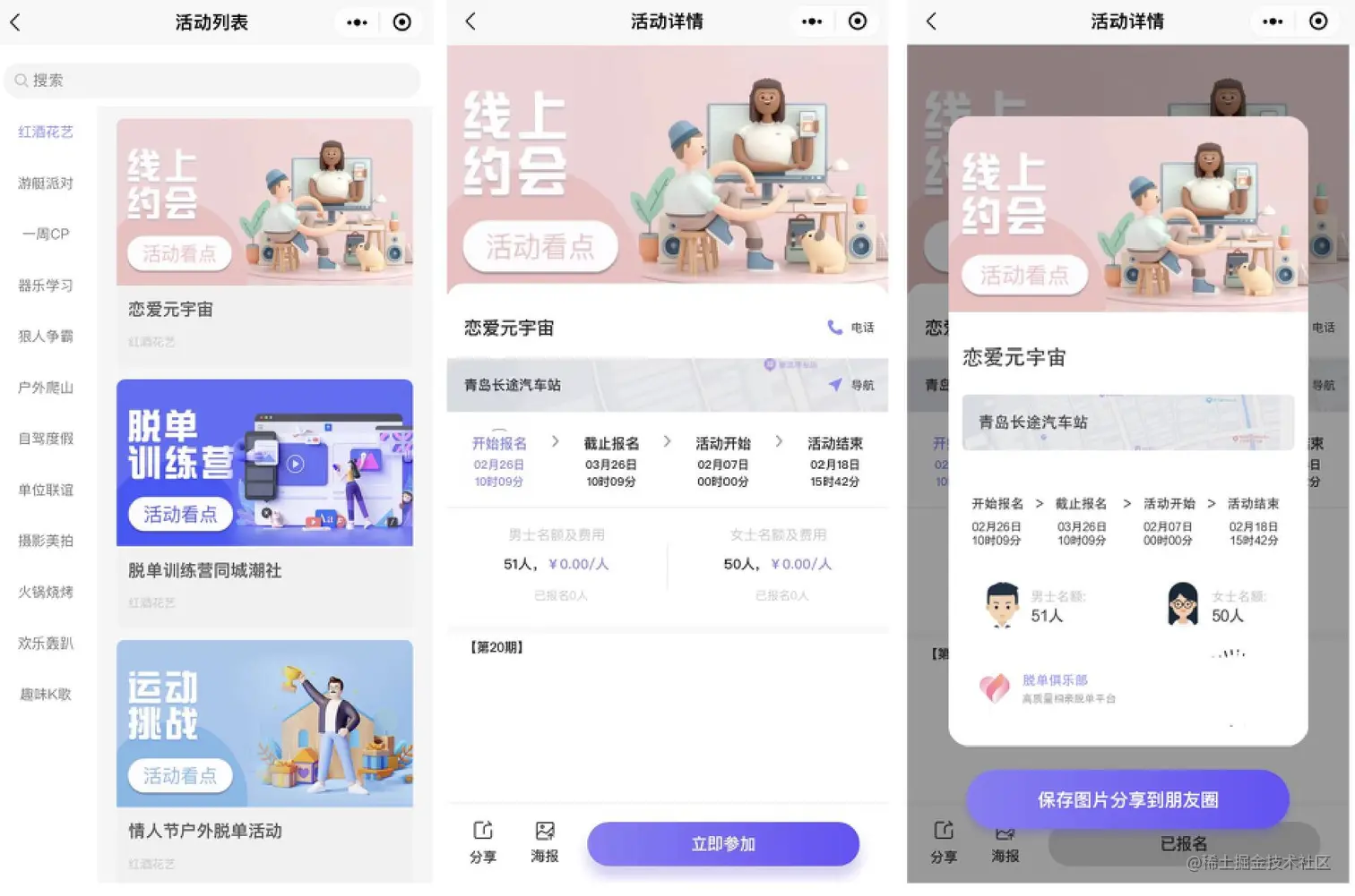 包括活动类别、活动列表、活动详情、活动海报、活动报名等