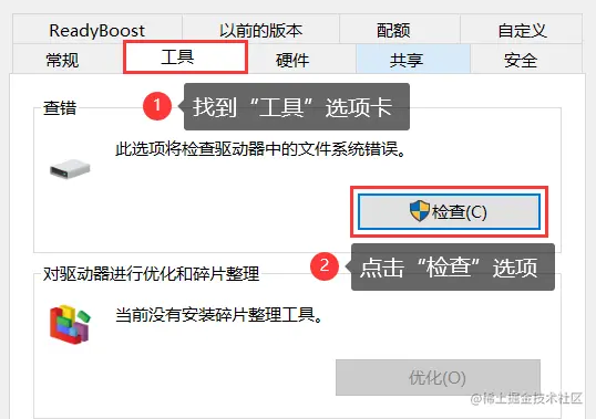 (2)然后在 【工具】 选项卡下单击 【检查】 。系统会尝试修复文件系统错误。