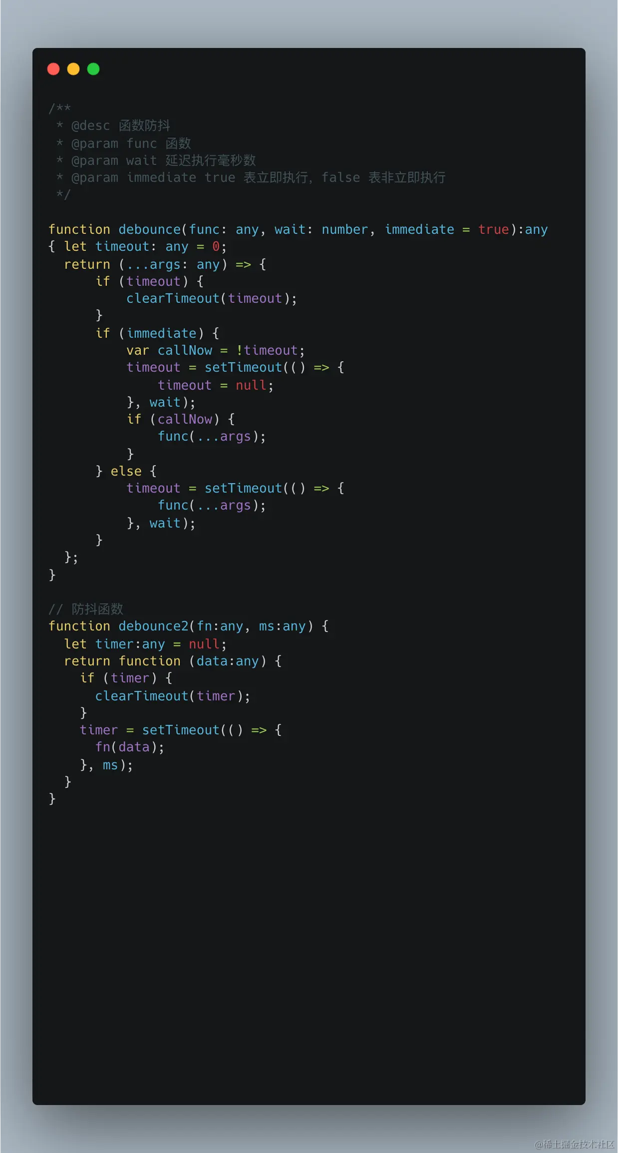 这样的功能,就叫做函数防抖,其实就是加上一个定时器,规定延迟一定时间去请求接口,防止函数短时间内被调用多次。要完成该函数,需要给予两个条件: