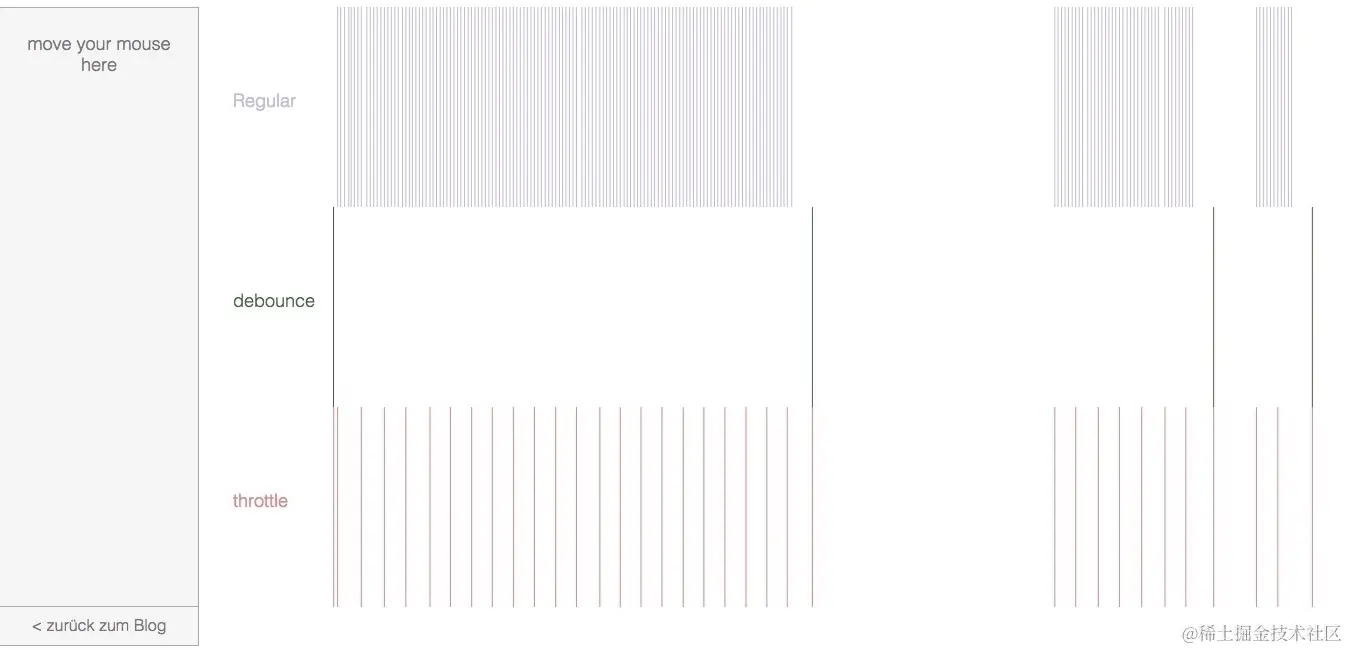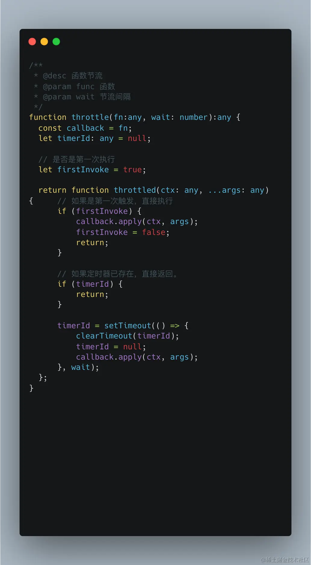 再看节流,throttle。节流的概念可以想象一下水坝,你建了水坝在河道中,不能让水流动不了,你只能让水流慢些。换言之,你不能让用户的方法都不执行。如果这样干,就是debounce了。为了让用户的方法在某个时间段内只执行一次,我们需要保存上次执行的时间点与定时器,通过比较当前时间和上次时间点之间的差值,当差值大于我们设定的gaptime的时候就去调用接口,这样就是每隔gaptime时间就操作一次。