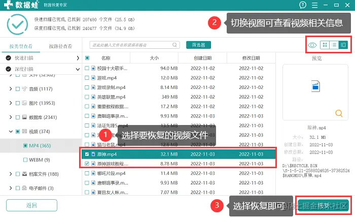 步骤2: 快速且深度扫描后,可以在 【切换视图】 切换不同的文件查看方式。然后选中文件,点击 【恢复】 。