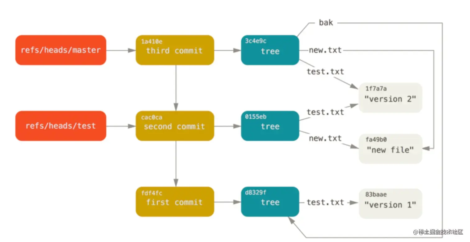 git 通过 blob 存储文件内容,tree 存储目录信息,commit 存储提交信息,这 3 种对象关联起来就是 git 的存储原理。