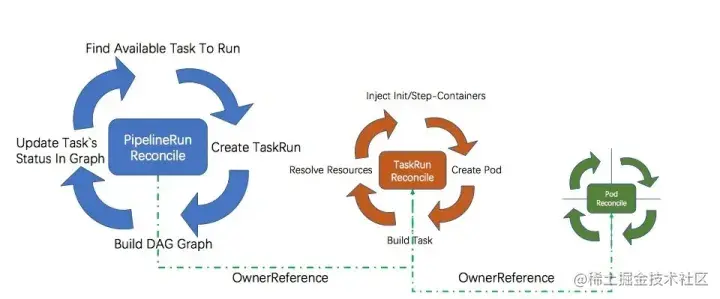 通过PipelineRunController 监听 PipelineRun 对象,将 PipelineRun 中所有的 Task 构建为一张有向无环图,创建 TaskRun。而 TaskRunController 监听 TaskRun 对象的变化,根据 TaskRun 引用的 Task,创建 Pod 运行 Step。
