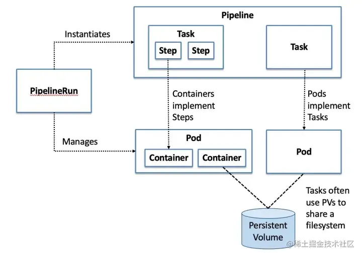 Tekton 引入了几个新的 CRD,包括 Task、Pipeline、TaskRun 和 PipelineRun