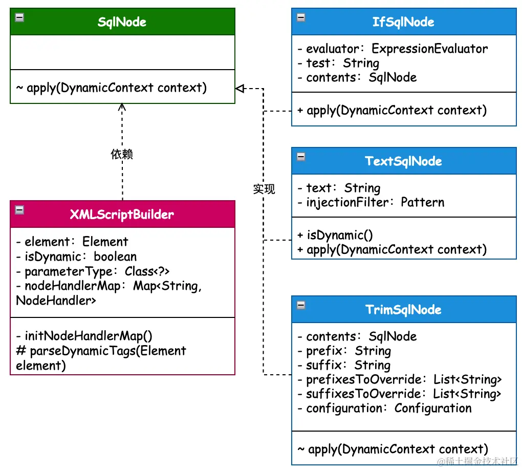 - 场景介绍:在 Mybatis XML 动态的 SQL 配置中,共提供了 9 种(trim/where/set/foreach/if/choose/when/otherwise/bind)标签的使用,让使用者可以组合出各类场景的 SQL 语句。而 SqlNode 接口的实现就是每一个组合结构中的规则节点,通过规则节点的组装完成一颗规则树组合模式的使用。