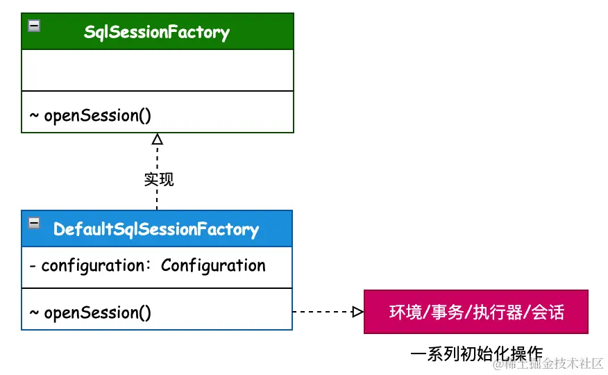 - 场景介绍:SqlSessionFactory 是获取会话的工厂,每次我们使用 Mybatis 操作数据库的时候,都会开启一个新的会话。在会话工厂的实现中负责获取数据源环境配置信息、构建事务工厂、创建操作 SQL 的执行器,并最终返回会话实现类。