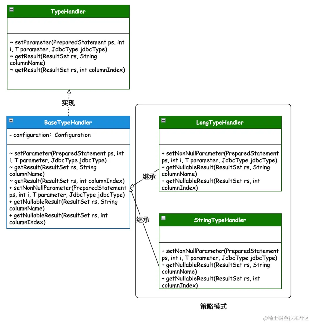 - 场景介绍:在 Mybatis 处理 JDBC 执行后返回的结果时,需要按照不同的类型获取对应的值,这样就可以避免大量的 if 判断。所以这里基于 TypeHandler 接口对每个参数类型分别做了自己的策略实现。