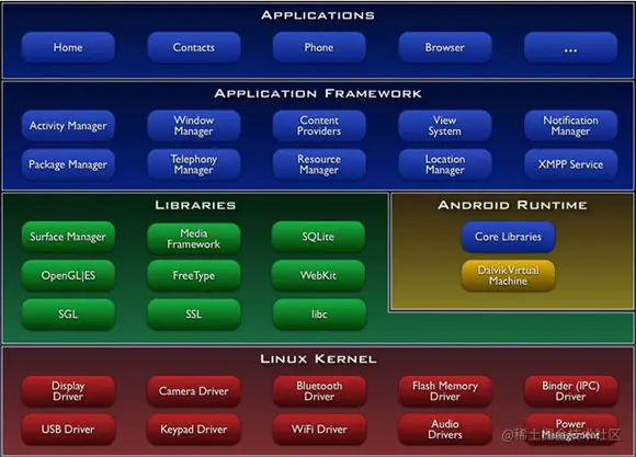 下面贴一张学习Android时常见的Android系统架构图: