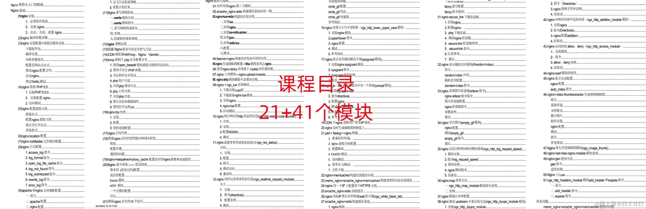 今天给大家分享一份 《Nginx入门到精通》 的文档资料,文档由Nginx基础和Nginx模块与案例两大部分组成,全文201页,共有21+41个模块,这份资料不仅适合0基础的同学,也适合巩固的学员使用。