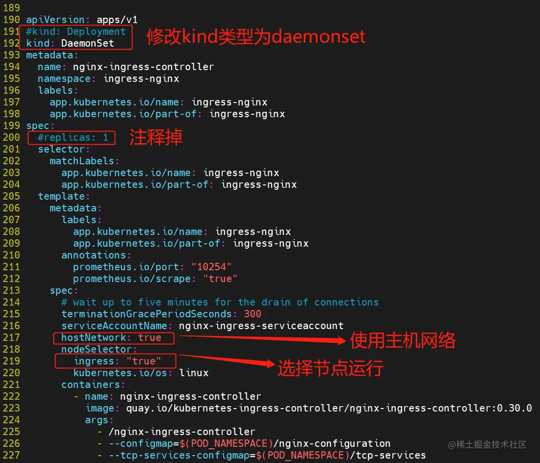 4、修改 Deployment 为 DaemonSet ,指定节点运行,并开启 hostNetwork 网络