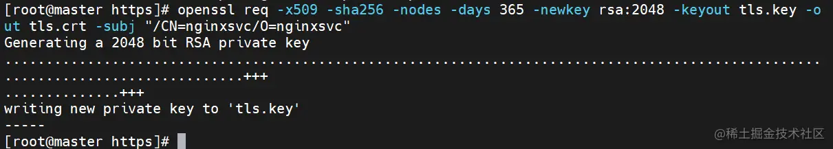 openssl req -x509 -sha256 -nodes -days 365 -newkey rsa:2048 -keyout tls.key -out tls.crt -subj "/CN=nginxsvc/O=nginxsvc"