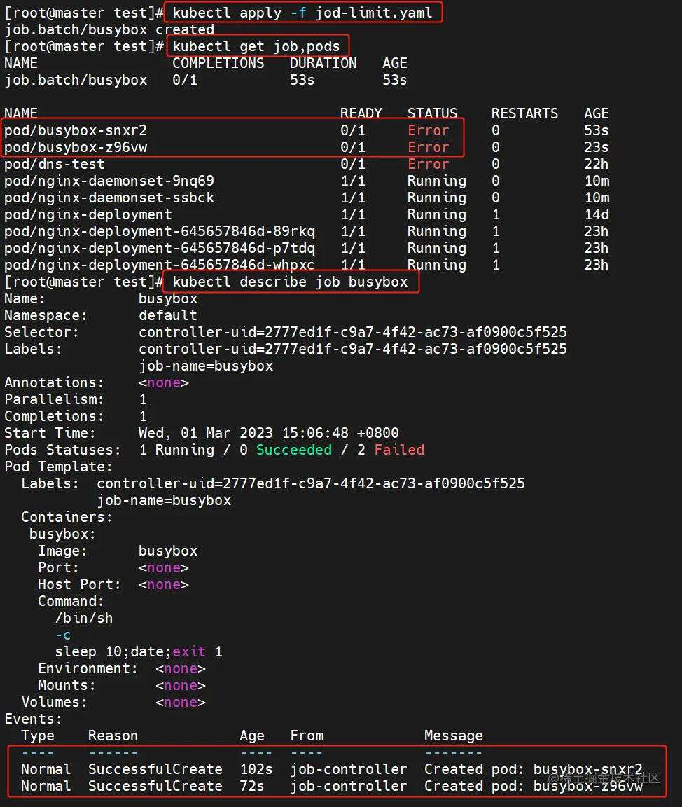 .spec.backoffLimit用于设置job失败后进行重试的次数,默认值为6。默认情况下,除非Pod失败或容器异常退出,Job任务将不间断的重试,此时Job遵循 .spec.backoffLimit上述说明。一旦.spec.backoffLimit达到,作业将被标记为失败。