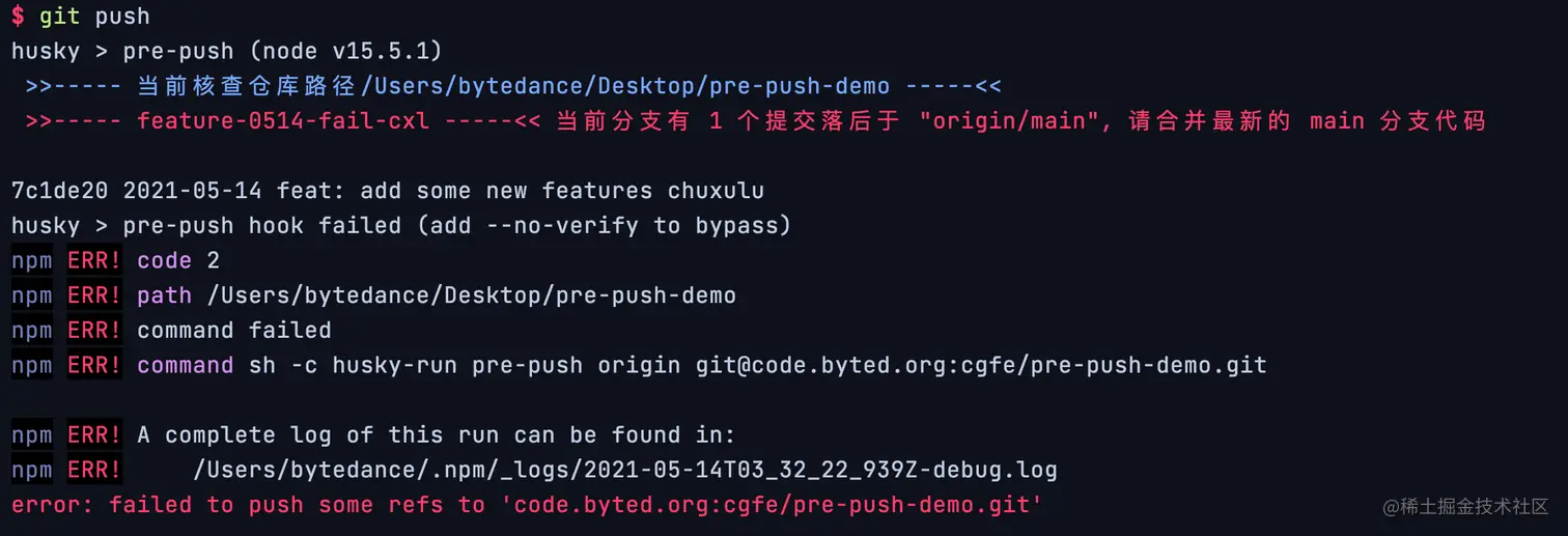怎么解决呢?我们要及时 rebase main 的最新代码,保证代码不会落后。这个时候就可以借助 git 命令实现自动化检查,当不符合要求时,代码会被禁止 push 到远程仓库。