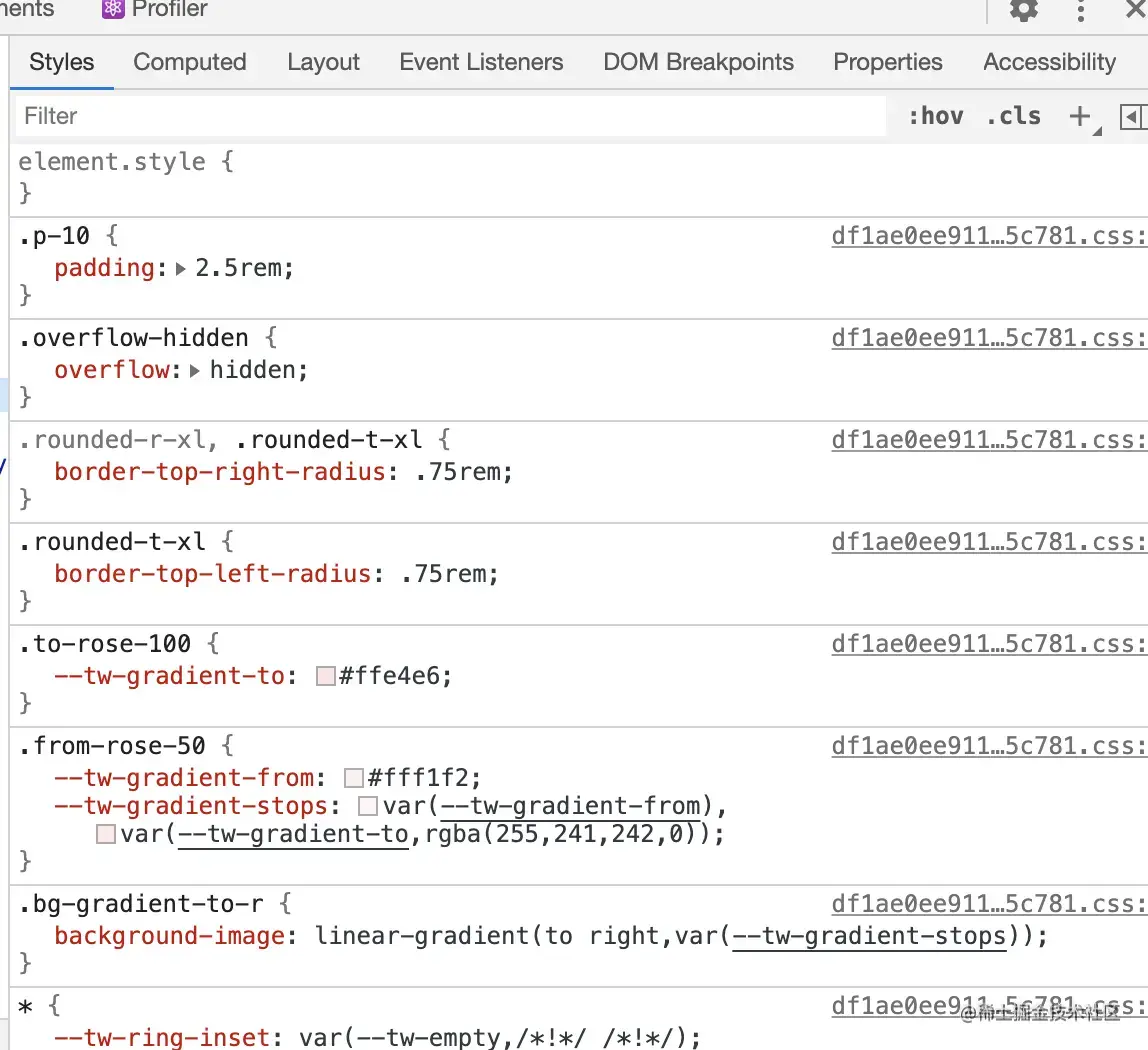 chrome ``devtools,还是可以一眼望到底的,而且没有以前各种 class 存在属性重复覆盖,造成调试困难,从下图可看出 tailwindcss 调试一目了然