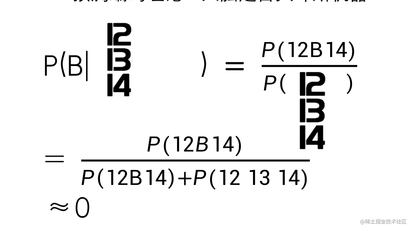但是我们知道 12b14 的概率远远小于出现 12 13 14 这样的一个概率。所以我们的大脑立刻就判断出来了,它不可能是 B,而是13。