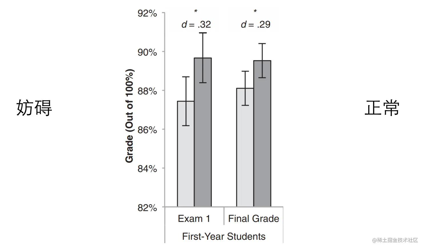 结果我们可以看到,发现那些说压力是正常的学生,他们的成绩比说压力会妨碍你的学生,他的成绩高了 0.32 个标准差