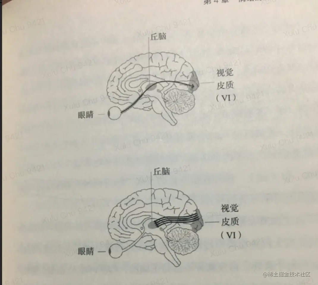 你对于你看见的东西的判断并不是来自于你看到它这个东西本身,就是像我们第一个图所见到的,眼睛看到了这个光的信号,然后传给了处理感官信号的大脑部位 —— 丘脑。