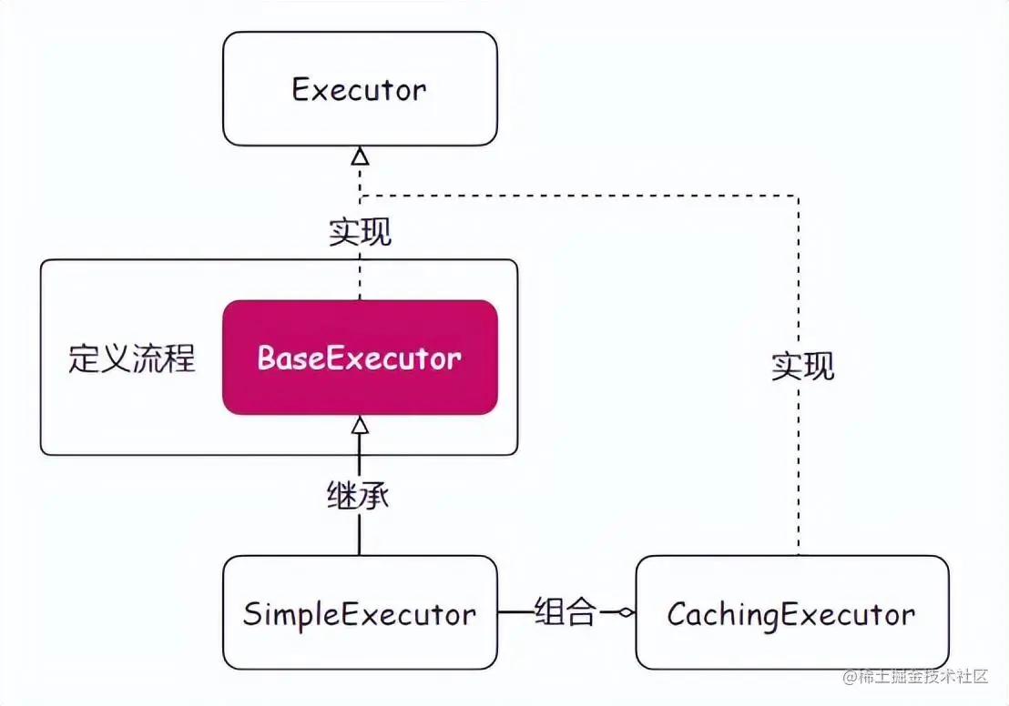 模板模式: 是一种行为型模式,在超类中定义了一个算法的框架,允许子类在不修改结构的情况下重写算法的特定步骤。场景介绍:存在一系列可被标准定义的流程,并且流程的步骤大部分采用通用逻辑,只有一小部分是需要子类实现的,通常采用模板模式来定义这个标准的流程。就像MyBatis 的BaseExecutor 就是一个用于定义模板模式的抽象类,在这个类中把查询、修改的操作都定义为一套标准的流程。