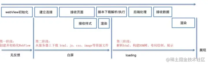 很明显,相对于原生应用只需要从后台拉取数据进行渲染来说,Webview多了初始化,拉取整个页面资源这2个步骤,而且他们的顺序是串行的。
