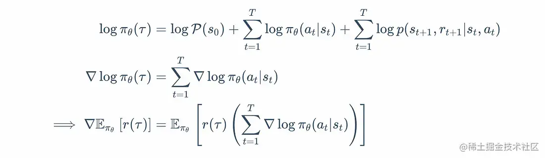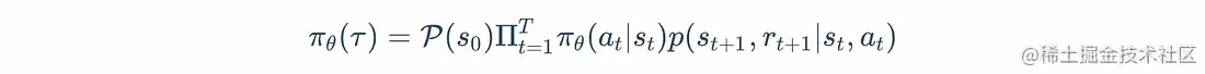 为了理解这个计算,让我们把它分解——P 表示从某个状态 s_0 开始的遍历分布。 从那时起,我们应用概率乘积规则,因为每个新动作概率都独立于前一个(还记得马尔可夫吗?)。 在每一步,我们都会使用策略 π_θ 和环境动态 p 采取一些行动来决定要转换到哪个新状态。 这些乘以代表轨迹长度的 T 个时间步长。 等价地,取对数,我们有