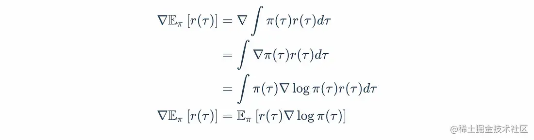这里的挑战是我们如何找到上面包含期望的目标的梯度。 积分在计算环境中总是不好的。 我们需要找到绕过它们的方法。 第一步是从期望的扩展开始重新制定梯度(略微滥用符号)。