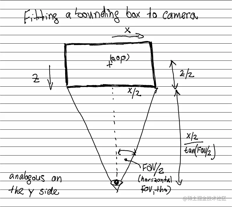为什么这样行得通? 因为我需要让边界框 (BB) 的整个正面尺寸可见。 所以 z 尺寸的一半让我从中心到 BB 的前面,然后利用一点三角函数让我在给定的纵横比和侧面尺寸的情况下得到正确的距离。