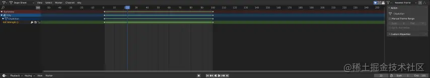 Init Strength参数为不同的值。 再次按 I 以在新值处插入关键帧。 你的时间表应该是这样的: