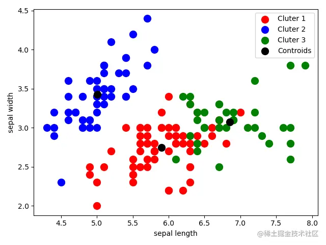 - (4)重复第2步和第3步,直到\sum_{i=0}^{n}\underset{c_j\in C }{min}(\left | x_j-c_i \right |^2 )