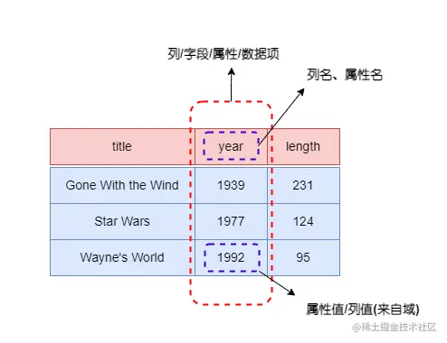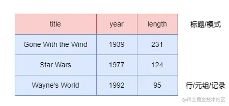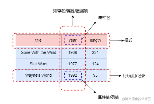 关系的列命名为属性(attribute)。关系名和属性集合的组合称为这个关系的模式(schema)。关系中出含有属性名所在行以外的其他数据行称为元组(tuple),每个元组均有一个分量(component)对应于关系的每个属性。
