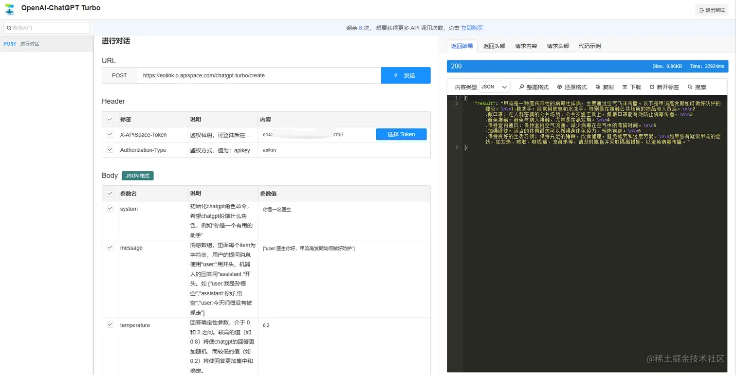 这是我在 APISpace 上进行体验的。为了方便广大国内开发者体验最新的 Chat API 的能力,APISpace 通过官方渠道直接接入 OpenAI 的 3.5Turbo 模型的 API。登录注册 APISpace,进入 3.5-Turbo 详情页,点击【免费试用】按钮,即可获得免费次数进行体验。