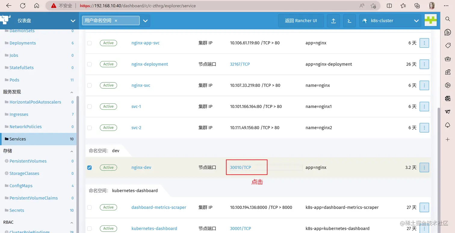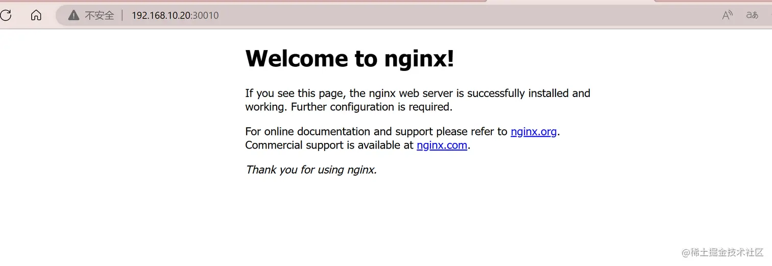 #点击 service 资源的节点端口 30010/TCP,可以访问内部的 nginx 页面了