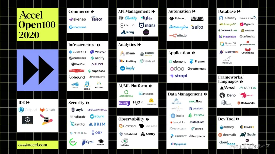 其结果是整个应用堆栈中的 OSS 初创公司的寒武纪大爆发。作为这一领域的长期投资者,Accel 决定通过创建 Open100 来规划其进展。Open100 汇集了在开源领域具有重要意义的快速增长的初创企业,以社区增长、商业演进和创新方法来衡量在新市场中推动 OSS 的采用。从最著名的公司到那些将开源引入新的垂直领域的公司,Open100 反映了将不断增长的开源运动商业化的初创公司的数量和广度。