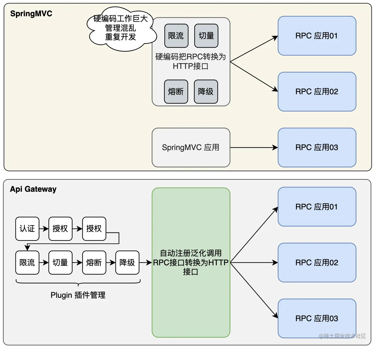 但这样的 RPC 却不是 WEB、H5、小程序 的 HTTP 调用,所以通常需要把 RPC 转换为 HTTP 协议。那么怎么转换,总不能一个个在 SpringMVC 中硬编码吧,这不是胡来吗!所以在互联网大厂应运诞生了 API 网关项目,它可以通过RPC服务的注册和发现机制,把接口注册网关中心,再通过网关算力执行接收 HTTP 请求协议进行解析做 RPC 接口的泛化调用。这中间还包括了;认证、授权、风控和服务治理的相关事项。