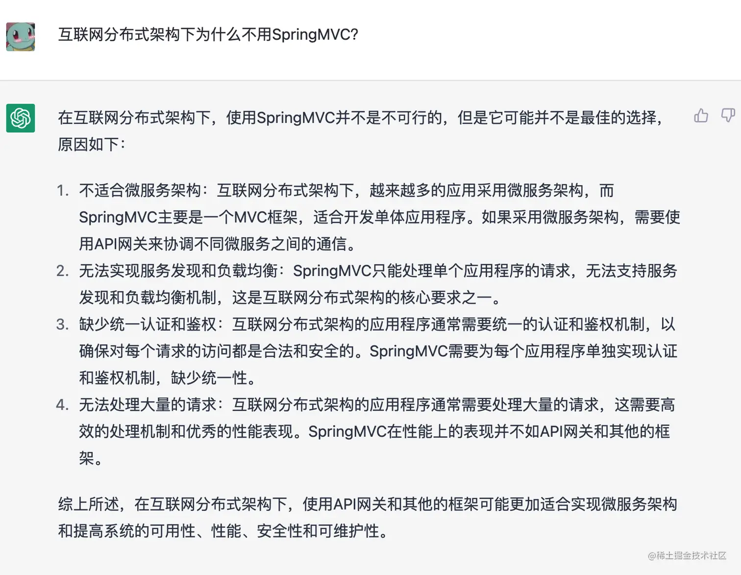 关于为什么不用 SpringMVC 或者很少使用这样的技术栈,ChatGPT 给出了这样的回答;