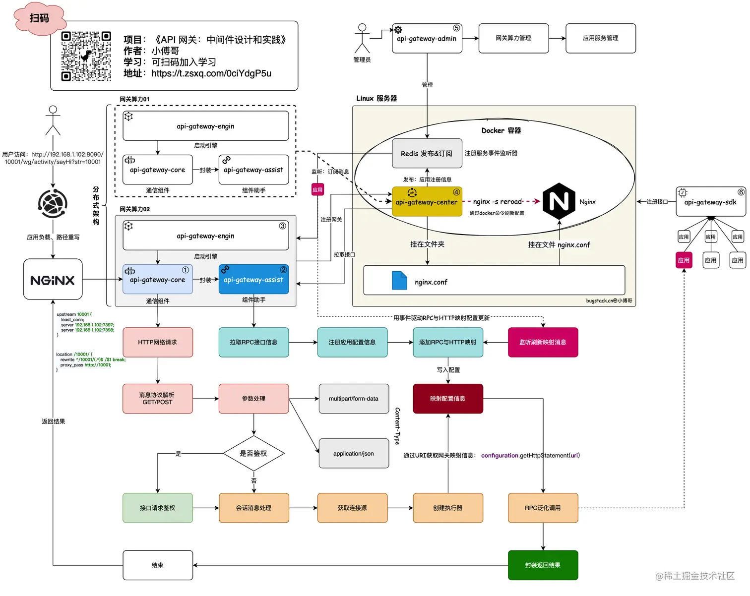 这是一整套API网关的核心通信模型结构图,以API网关算力的多套服务注册到网关中心开始,拉取RPC应用接口并完成映射HTTP调用操作。最终允许用户通过 Nginx 访问和路径重写的负载均衡管理,调用到具体的网关算力中执行协议解析和RPC接口的泛化调用并最终返回结果数据。—— 就这套架构设计学习完,就够你晋升到P7岗了!