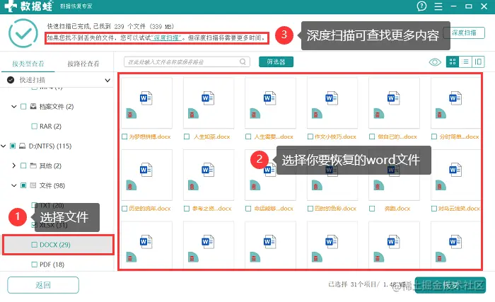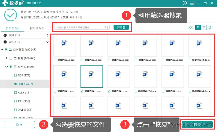 4.等待深度扫描完成,可利用 【筛选器】 直接搜索要恢复的文件,选择好所有要恢复的文件后,点击【恢复】;