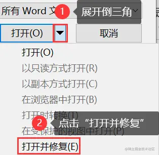 3.找到要修复的文件,单击【打开】旁的倒三角,点击 【打开并修复】 即可。