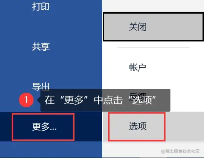 - 在Microsoft中点击【文件】,在【更多】中找到【选项】;
