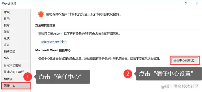 - 打开Microsoft,点击【文件】,在信任中心中点击【信任中心设置】;
