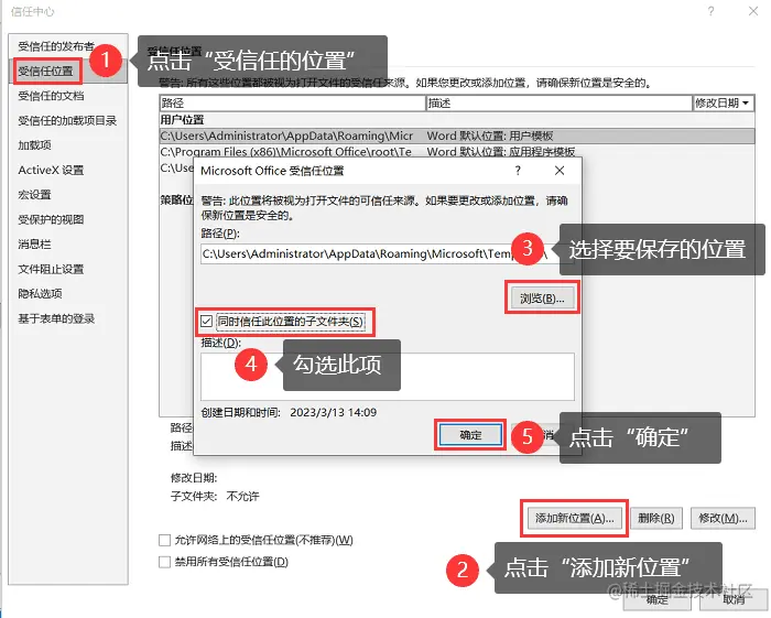 - 点击 【受信任位置】 ,点击右侧【添加新位置】;