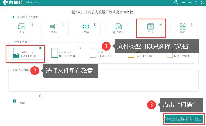 2.进入页面后,如果只需恢复重要文档,勾选【文档】 并选择文件所在的磁盘后点击【扫描】;